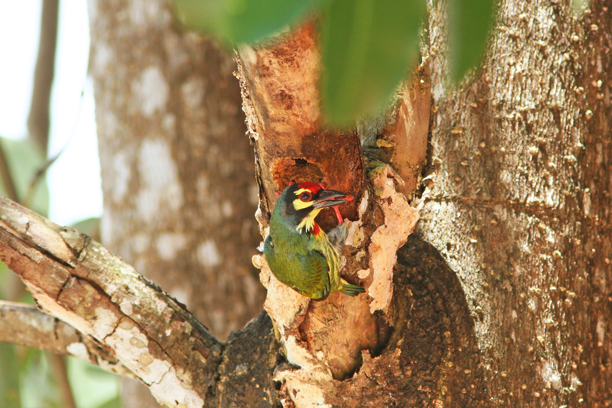 Coppersmith Barbet (Megalaima haemacephala) is another common bird that can be found easily even within the city area. You might wonder why it is called like that, just listen to its call in the YouTube video here. The call resembles the sound of coppersmith hitting copper. Although being common, the bird always fascinates me with its super colourful appearance. Last week, I noticed a bird coming to the Dita Bark (Alstonia scholaris) tree in front of my house. Two days later, I noticed a small hole on one broken branch. I waited and finally, the same Coppersmith Barbet showed up and flew right to that hole and started to dig. Barbets are like woodpeckers; they dig holes for their nests. I was so happy to see the first Coppersmith Barbet building a nest in my house.